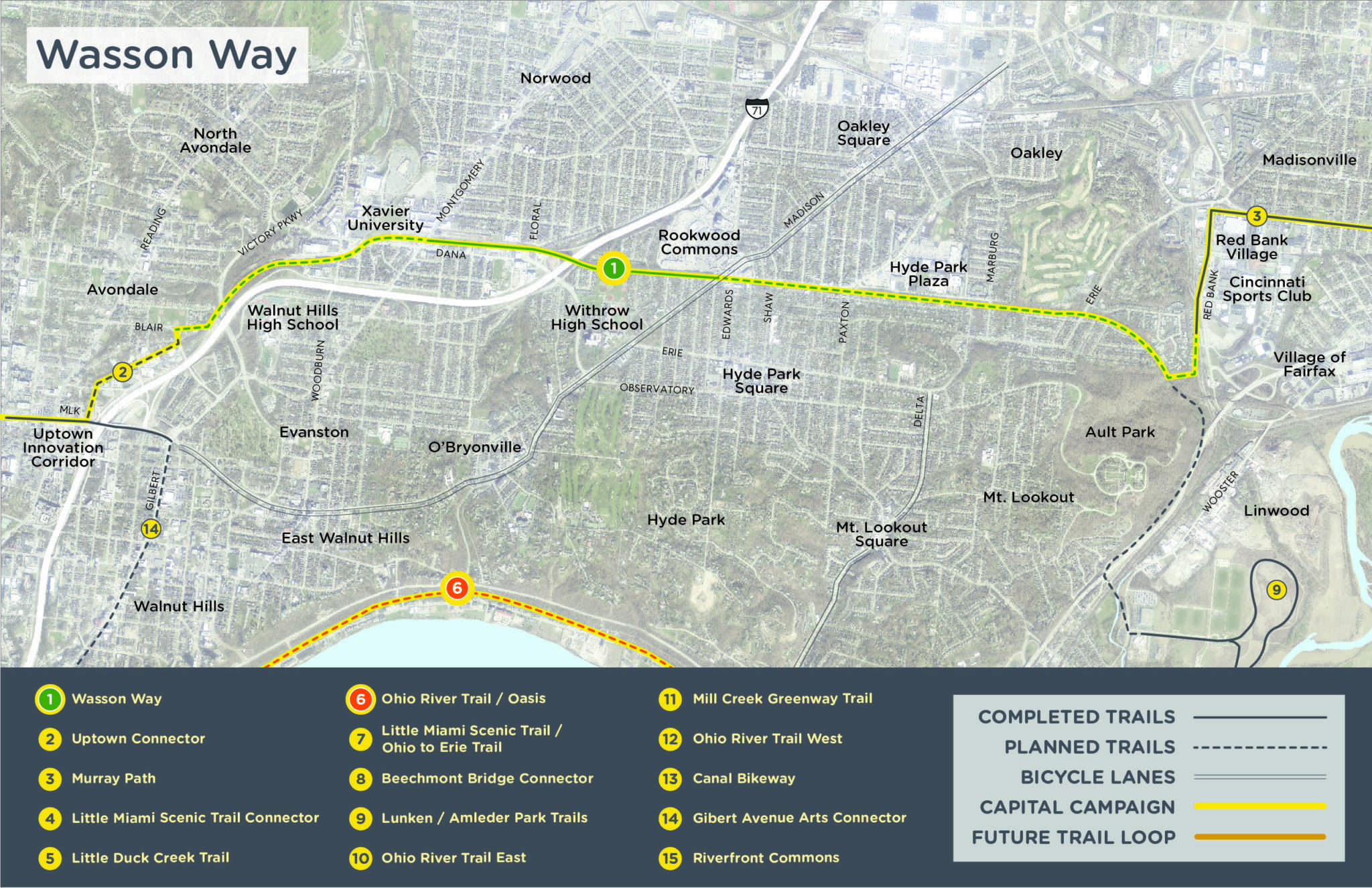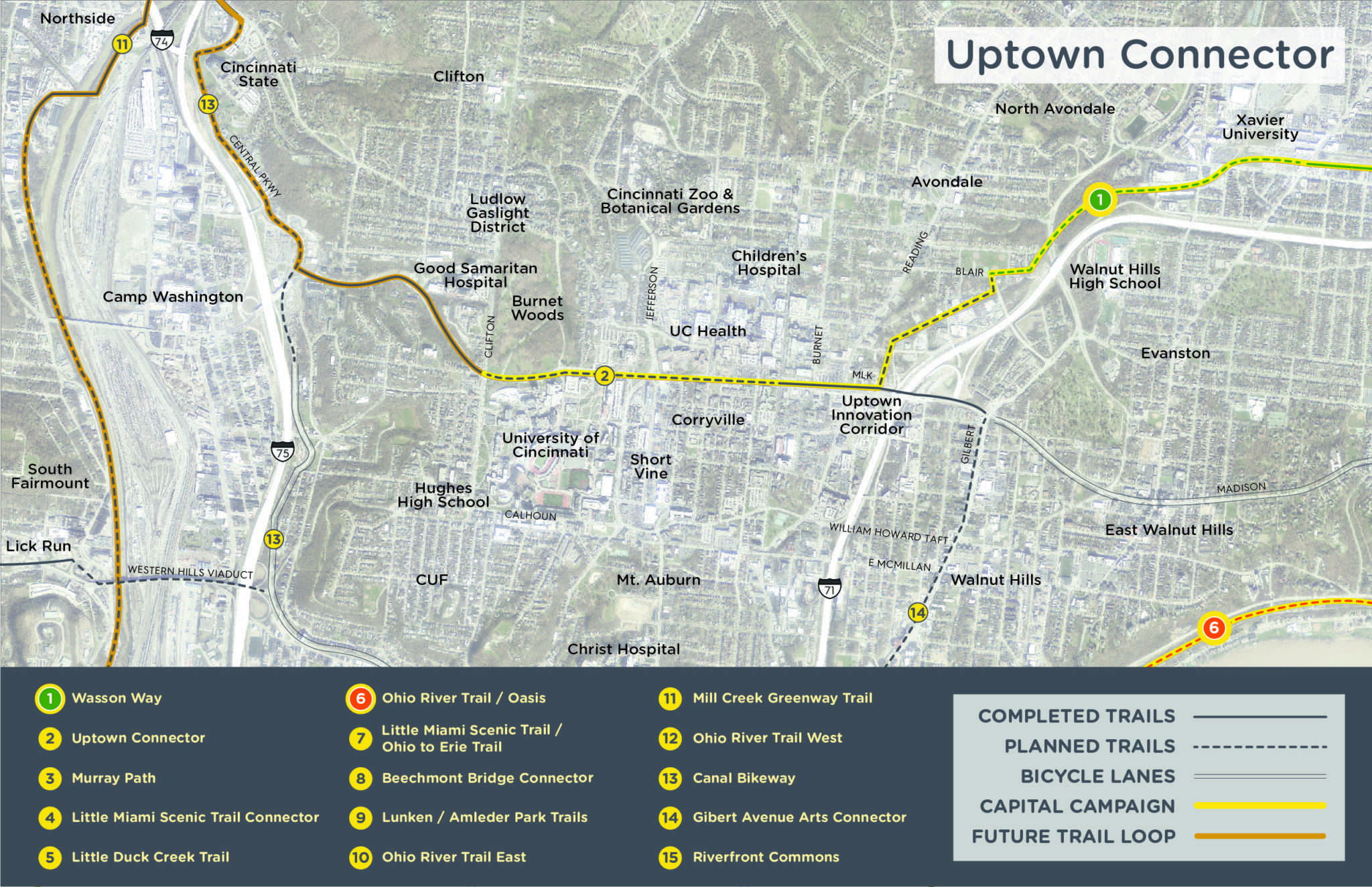 When complete, CROWN will form a network with the following trails in development: Wasson Way, Ohio River Trail East, Little Miami Scenic Trail, Ohio River Trail West, Mill Creek Greenway Trail, and Canal Bikeway. Building the CROWN will transform Cincinnati into a leading destination to live, work, and play by linking our regional trails and reconnecting our neighborhoods.